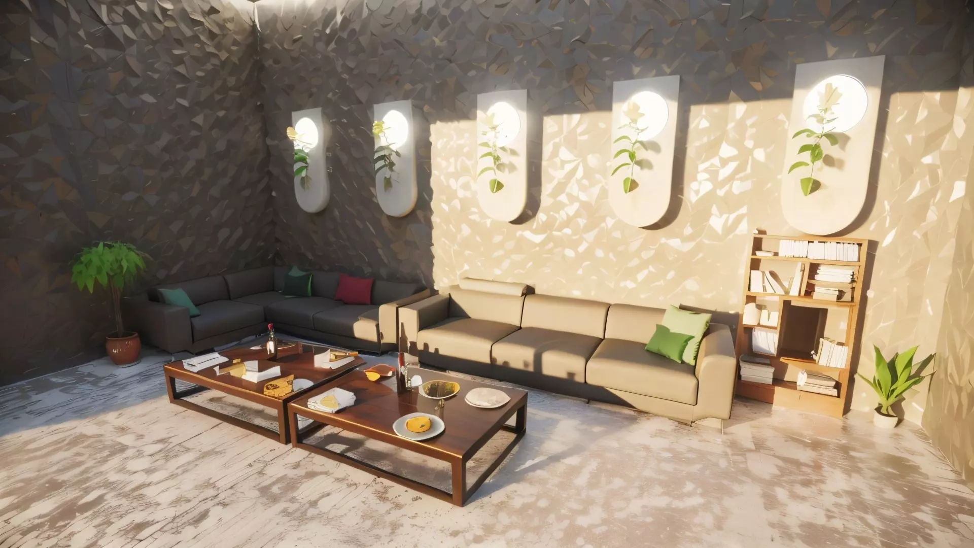 This is a contemporary wall-mounted planter design that features an elegant series of oval frames, each encapsulating a sunflower basking in artificial sunlight. The planters are seamlessly integrated into a textured wall with a geometric pattern that adds depth and modernity to the space. Below, there is a modest-sized wooden cabinet with minimalistic shelves, suggesting a preference for clean lines and uncluttered surfaces. The soft-toned sofa with a single green cushion adds a touch of coziness, contrasting the wall's sharp angles with its softness and inviting warmth. The overall effect is of a harmonious blend of nature and design, where organic shapes and man-made forms coexist beautifully.