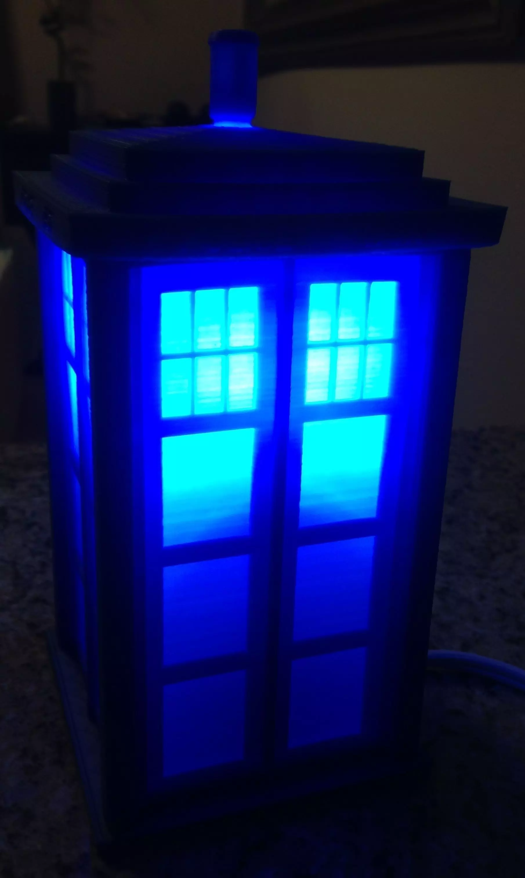 Get your Whovian on with this six one-hundredths scaled model of a circa 1960s London Police Call Box. This TARDIS lamp stands at 7.75 inches tall with a base of 3.75 by 3.75 inches. The model includes a standard base for an A19 size, 60-watt compatible LED light bulb or a candelabra base for an LED candelabra bulb. Other assembly components not included are an 8 inch white cord set with switch, a 250-watt ceramic hard-wired ceiling socket or 2 inch candelabra socket (see pics or [Standard Base Assembly Instructions](http://www.outerbankslights.com/wp-content/uploads/2014/12/TARDIS_Lamp_Assembly_Standard_Base.pdf) or [Candelabra Base Assembly Instructions](http://www.outerbankslights.com/wp-content/uploads/2014/12/TARDIS_Lamp_Assembly_Candelabra_Base.pdf)). The recommended filament color is blue. For the best and most detailed results, set the extrusion speed at 20mm/s for the Lamp Top component. This translates into a Fine or Detailed setting if streaming. The streamed files follow this order: Candelabra Base, Standard Base, Middle and Top.