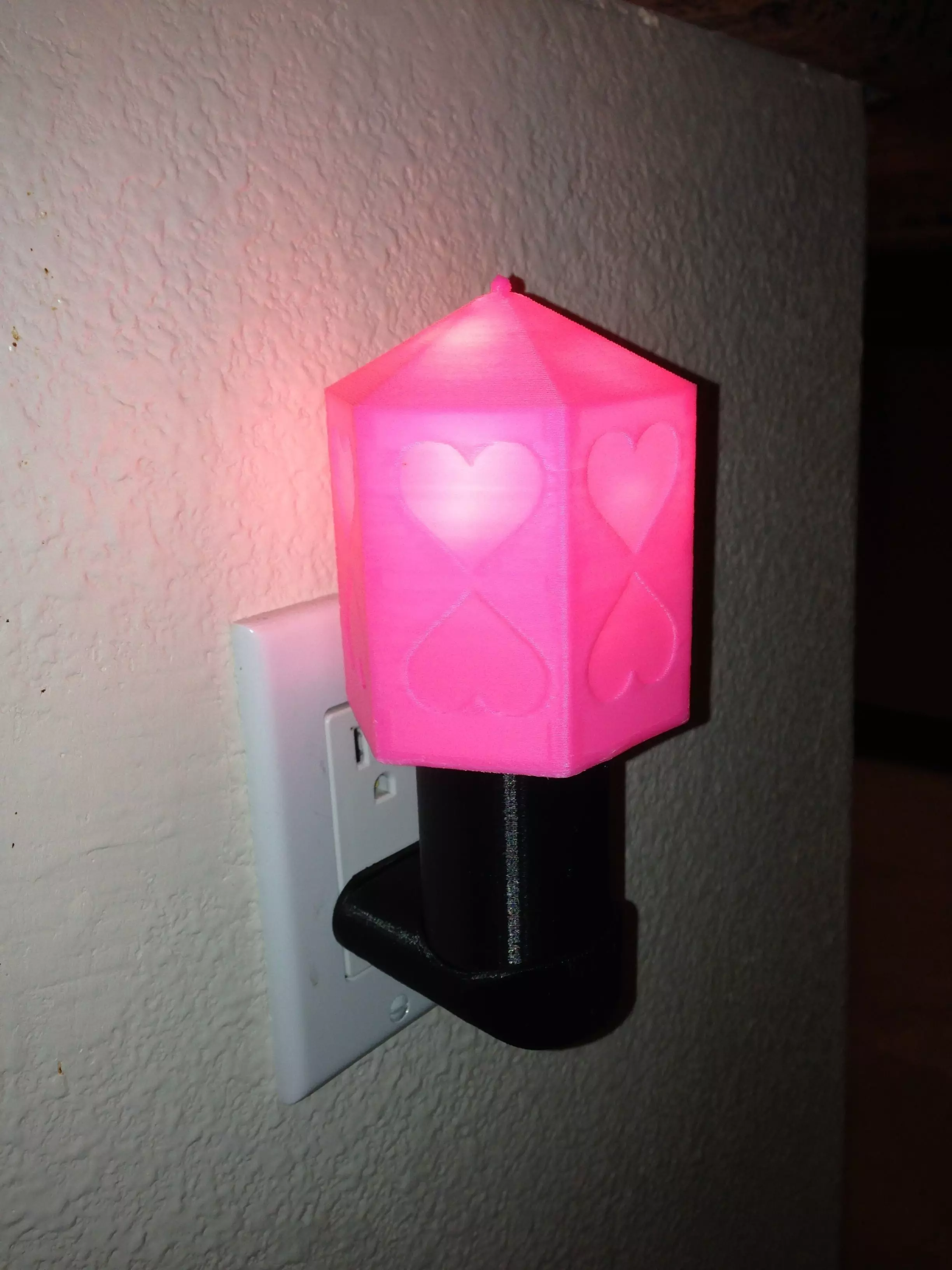 This night light contains a lit hexagon with heart designs and stands at 6 inches tall with a width of 3 inches. The heart design includes a socket a plug for use in the evenings as ambient lighting or a romantic gesture. Other assembly components not included are a two-inch candelabra socket, a 15-Amp, 125-Volt Black 2-Wire Plug, standard lamp cord (cut to fit) and an LED candelabra bulb (see pics or [Assembly Instructions](http://www.outerbankslights.com/wp-content/uploads/2014/12/Night_Light_Valentine_Hexagon_Assembly.pdf)). Recommended filament color(s) include red or pink for the hexagon and black for the plug and socket. For the best and detailed results, print all components at an extrusion speed of 20mm/s. This translates into a Fine or Detailed setting if streaming. The streamed files follow this order: Plug, Socket and Hexagon.