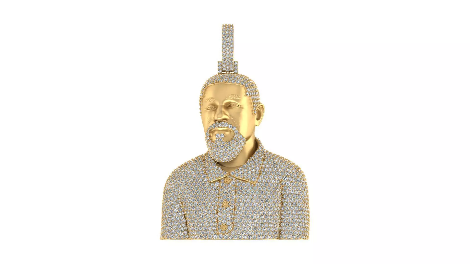 The pendant is encrusted with 1,181 diamonds, each carefully set to enhance the sculpted contours of the face, hair, and clothing. The diamonds vary in size to complement the intricate details, with a total gemstone weight of 15.0 carats, ensuring a brilliant shine and luxurious appeal. The lifelike representation of the portrait, paired with high-quality materials, makes this pendant a true work of art.