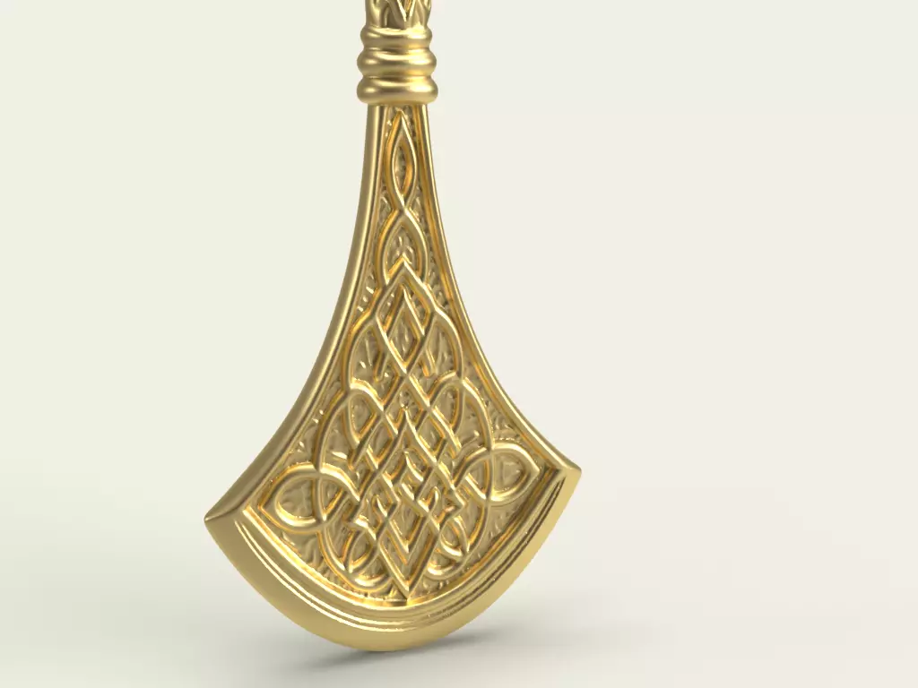 This 3D model features a Nordic-inspired ornamental axe pendant with traditional knotwork patterns and a clean sculptural silhouette.