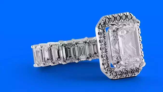 This luxurious emerald-cut diamond engagement ring is designed with precision and elegance, perfect for photorealistic rendering, animation, or jewelry design projects.