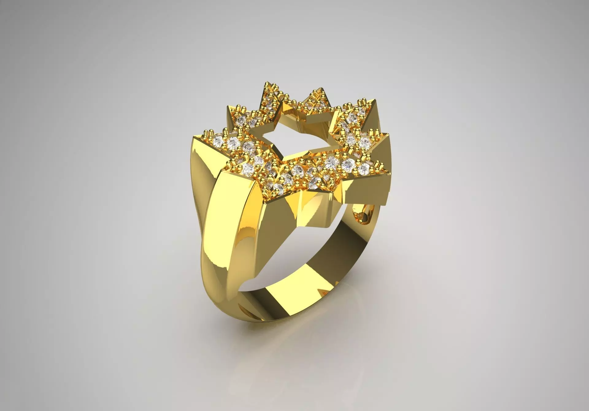 This ring features a bold and artistic design with a star-shaped top adorned with several sparkling stones. Crafted from gold, the band has a shiny finish that emphasizes its elegance. The central star motif is intricately shaped with pointed tips that add to its dynamic and modern look. Surrounding the star are smaller stones that enhance the overall sparkle and create a captivating halo effect. The wide and comfortably shaped band creates a sturdy feel while maintaining a stylish look. This ring is ideal for making a statement and is perfect for special occasions.