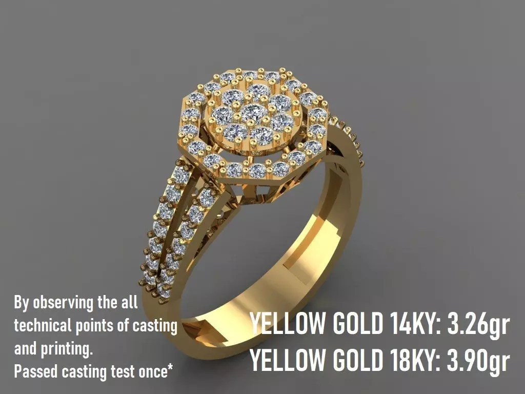 The use of circular and octagonal shapes and placing round stones on them is what makes this beautiful wedding ring unique and special. This ring in size 53EU was designed by Matrix 9 and rendered by V Ray. It does not have any technical problems and has passed the casting and manufacturing test once and is now ready for casting and printing. Stonesetting cutters have also been used for the work. 6 different formats have been prepared for you:** STL, 3DM, FBX, AMF, 3MF, and OBJ**, and f you need other formats or sizes, message me.