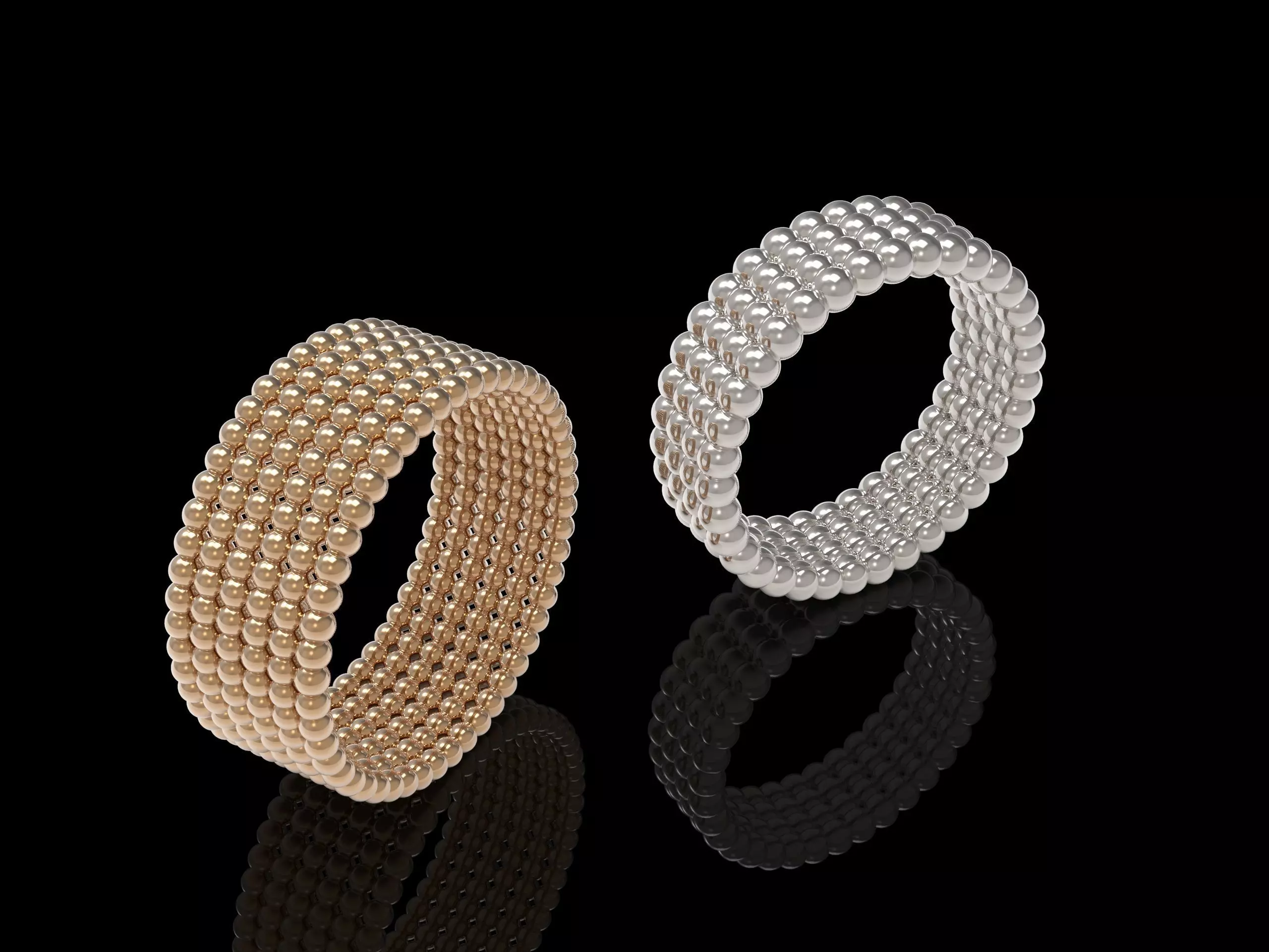 This high-quality 3D model set features two intricately designed rings made of small, uniform metallic beads, arranged in a continuous band pattern. One ring is rendered in elegant yellow gold, while the other is crafted in polished silver, offering a sleek and modern contrast.