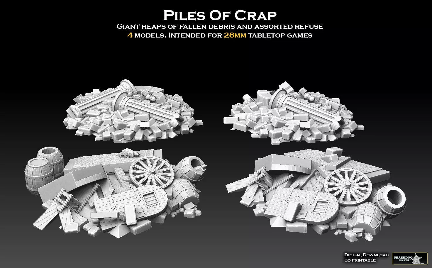 This model pack contains four large heaps of debris (fallen pillars, collapsed arches, mounds of bricks) and refuse (splintered timber, broken wagon wheels, furniture and barrels), some infested with rats.The heaps were originally designed for a dungeon boardgame tileset (still unpublished at the time of writing this). It occured to me that tabletop players might find use for the heaps as standalone models. Suggested use is as rubble blocking city streets, improvised barricades, strongpoints for entrenched infantry, et cetera. The models can be used for any scale between 15mm and 54mm, but are prescaled to 28mm.