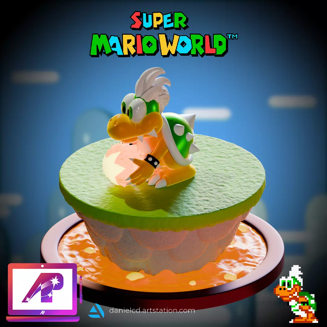 NOTE: Only head and Magic Ball, the rest is in Iggy's model.Larry's second appearance is in the last world of Super Mario World, the Valley of Bowser. In battle, he uses Iggy's attack pattern and defeating condition. He sits on top of a tilting platform on top of lava and is immune to all of Mario's attacks. However, unlike Iggy, Larry's platform has three Lava Bubbles that jumps up and down. He can also throw more than one fireball at one time. Larry needs to be jumped on until he falls off his platform. After the battle, Mario kicks away his castle and gains access to the Front Door. This is Larry's first time being the last Koopaling to fight so far. Like the other Koopalings, his in-game design does not match official artwork.