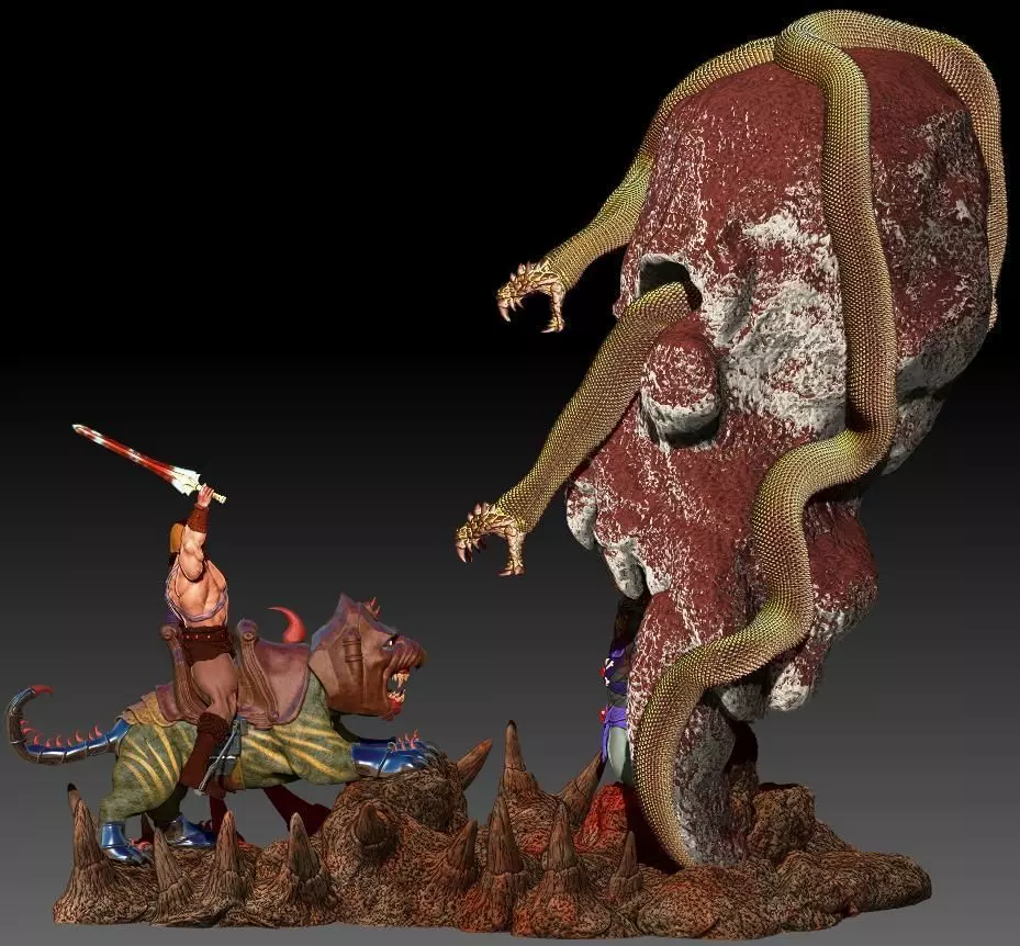 Diorama He-man. Demonic version, conceived and created by me. In this dystopian He-man universe, I imagined a situation where the skeleton is subjugated and executed by the He-man. Skeleton is chained to the grayskull castle doors. He manages to attract his magic staff with his attraction force, but he-man is faster and before he can use his power, he-man cuts his head off. Soon after, he-man displays his head in a bag. The snakes that accompany skeleton are furious and advance towards He-man trying to avenge him but the result you can imagine what it will be. Model ready for 3d printing, in high resolution.